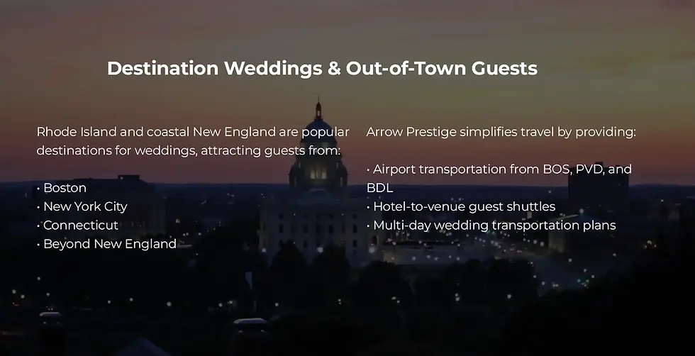 Arrow Prestige Limousine & Coach provides elegant, reliable wedding transportation across Rhode Island, Massachusetts, and greater New England, helping couples, planners, and families move seamlessly from celebration to celebration.